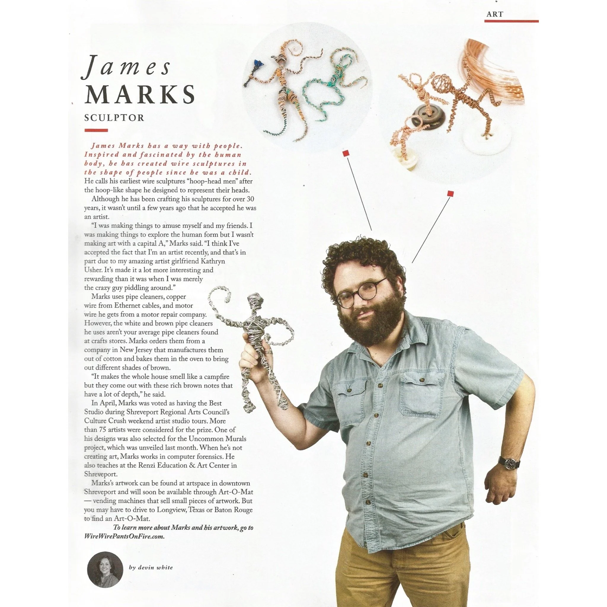 A self-taught artist takes his art to the streets. James Marks posts an army of wire men in the gritty downtown of a Louisiana city, among graffiti tags and shoes flung over power lines.